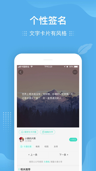 我要个性是一款主打美图头像分享的软件,如果想要让自己的头像、手机壁纸更具个性的话,那么这款软件绝对不会让你失望!其汇集了海量优质高清美图任你随心收藏下载,更有众多网友共享的美图资源,且用户还能对资源进行评论互动!同时软件还会根据用户的偏好在首页推送相应的图片,更懂你!此外,更有大量个性签名为你增添更多风格!
