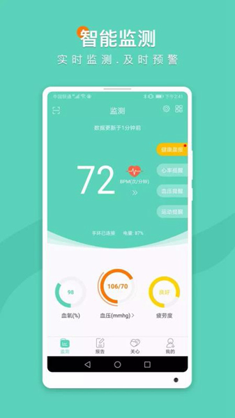 1、可以在app之中绑定智能手环,借助智能手环可以实时监测身体;