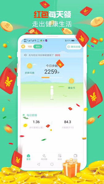 4、独特算法,精准计步,步数赚钱。运动分析详细记录里程数和总消耗,帮助健身有效减肥。