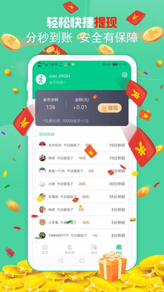 记录走路数据,每天可以将步数兑换成金币,我们真正做到了金币秒提现