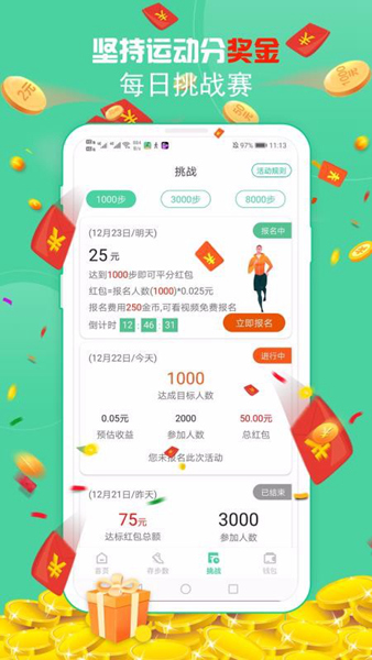 一共三档挑战赛,分为1000步、3000步和8000步,挑战难度越高,奖励越丰厚。每日报名参加比赛,第二天达标后即可和大家瓜分奖金池