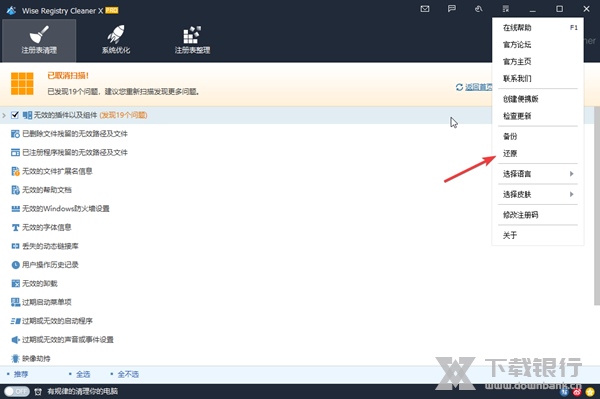 请打开软件,单击“ 菜单” - “备份”,然后可以创建系统还原点或完整注册表备份。或单击“还原”,可以选择还原注册表或系统还原点。