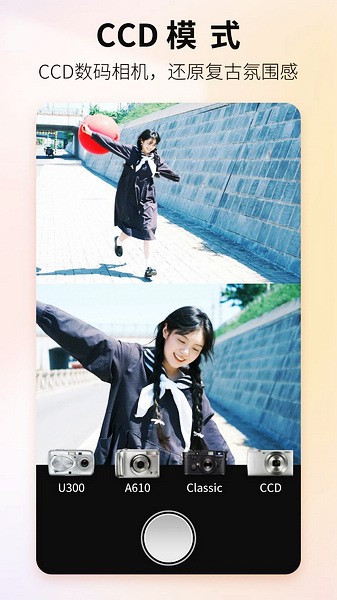 2、我们选择ccd模式,它还为我们提供了非常丰富的胶片相机,不同的相机拥有不同的滤镜,用户只需点击动检的拍摄按钮即可;