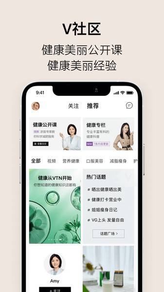 4、V社区:营养师,健康美丽专家,资深用户荟聚,分享保养知识和经验;VTN特邀国际营养师、三甲医院专家、专业美容师,提供健康美丽公开课;