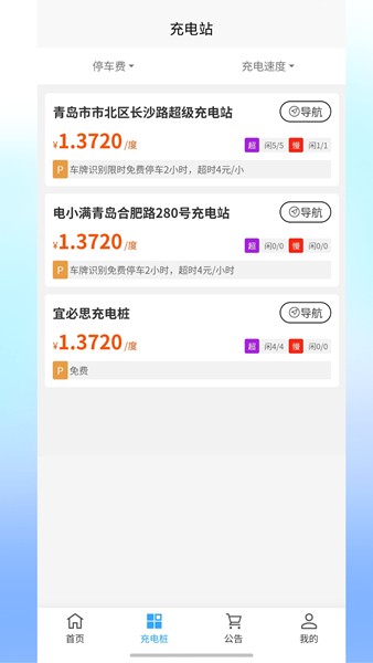 用户能够在线切换停车费、充电速度等条件,查找周围附近的充电桩资源;