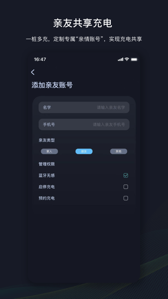 亲友共享,桩主可为家人配置专属“亲情账号”,轻松实现与家人共享充电。