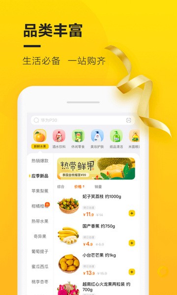 4.商品种类繁多,服务功能全面,囊括生鲜水果、零食饮料、早餐便当、美食外卖等;