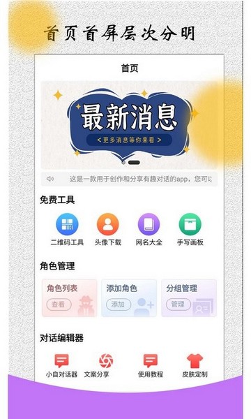 角色对话生成器免费版App是一个对话生成的应用工具,在这里,不但内置头像下载、二维码工具以及网名大全等丰富功能进行提供,你完全可以将其用于小伙伴之间的恶搞和娱乐,不过也要注意恶搞适度,避免对彼此之间的感情造成难以挽回的磨损,而且角色对话生成器支持根据自己的相关需求和喜好模拟各种对话界面内容,并且能够完美为你模拟出十分详细的转账信息,充分满足你多样化的恶搞娱乐需求。