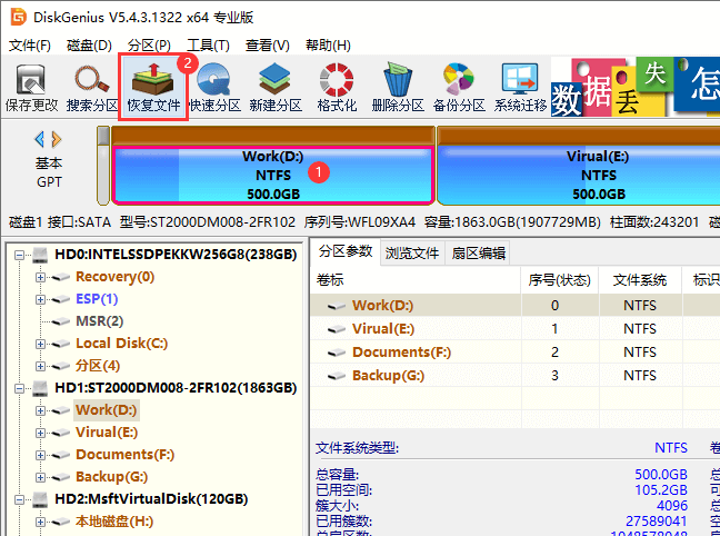 2、选择需要进行删除文件恢复的分区,然后点击"恢复文件"按钮,如下图所示。