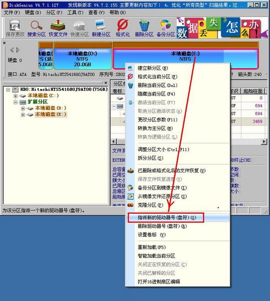 1、打开diskgenius,对要修改盘符的分区右键点击”指派新的驱动器号(盘符)“,如下图