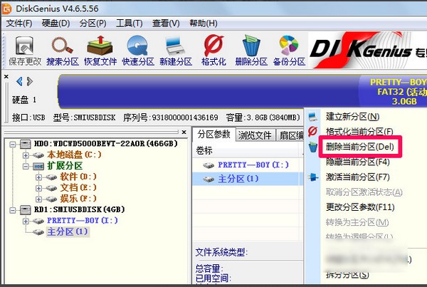 1、我们首先打开DiskGenius软件,然后可以看到当前显示的硬盘,我们选择删除分区。