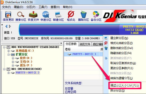 6、使用diskgenius调整分区大小为最大就可以了,这里我们可以鼠标放在两个盘符中间拖动调节,也可以直接鼠标输入