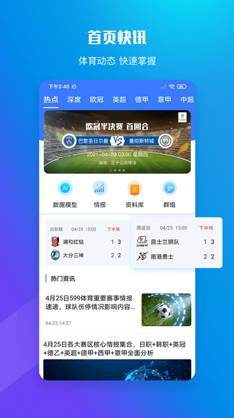 提供体育资讯、比分直播、足球比分、足球动画、足球数据、篮球比分、球迷群聊、球迷社区等主要功能。
