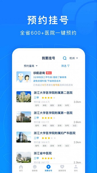 1、提供浙江省500家重点医院预约挂号服务;