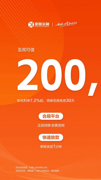 借款额度至高20万,灵活分期,快速审核,合规平台,信息安全,息费透明,年化利率10.8%-24%(单利),实际借款额度、通过率、利率以客户申请时的风险评级而定。新客用券借款享至高30天免息,具体活动细则以星图金融APP内展示为准。请根据个人能力合理贷款,避免逾期