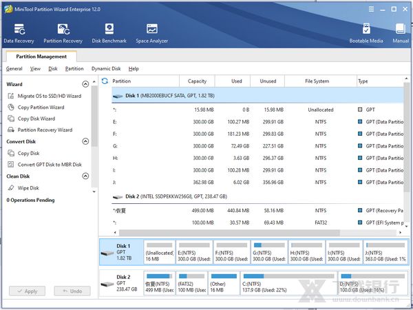 MiniTool Partition Wizard是一款硬盘管理软件。该软件能够帮助用户对磁盘上进行调整、管理、删除、创建及格式化的分区等操作。软件还可以恢复那些并未分配的空间上删除或丢失的分区,以及那些恢复硬盘在重新分区之后又丢失的那些分区。有需要分区的小伙伴不要错过哦~