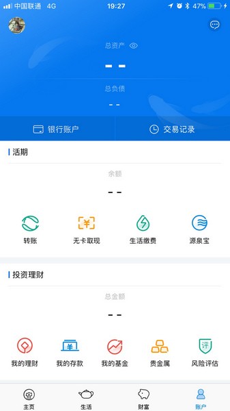 投资理财:提供定活期互转、通知存款、理财产品,基金,贵金属、源泉宝、第三方存管、大额存单、理财风险评估等服务。