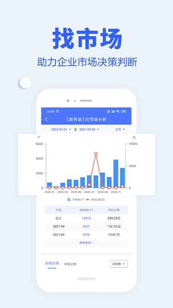 智能分析:拥有独有的数据统计分析能力,能够对招投标行业进行深度可视化分析,以柱状图、折线图等样式,动态分析行业宏观走向和微观信息。帮助经营决策者准确把握相关行业的市场现状及发展趋势,为投标人作出前景预判,挖掘潜在项目以及行业深耕价值。