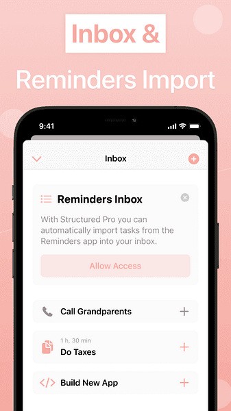 软件还有好多贴心的功能,比如我可以给每个任务加上图标和颜色,这样分类起来更清晰。如果我很难集中注意力,Structured会帮我规划一整天的安排,并且提醒我不要被其他事情干扰。特别是它的主屏幕插件,能让我随时看到当天的任务,感觉特别方便。另外,它还能自动导入我的提醒事项,收件箱功能也能帮我把不确定时间的任务收纳起来。
