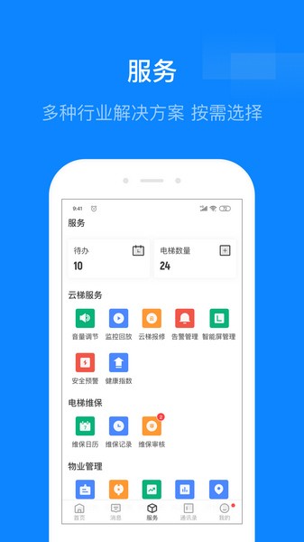 3. 服务板块: - 云梯设备服务:云梯报修、发布通知、音量调节 - 电梯维保服务:维保计划、维保记录 - 增值服务:到家服务