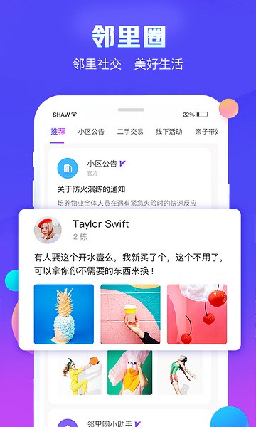 邻美社区也可以叫做泰华幸福家,是一款专为业主打造的社区软件。软件内为大家准备了非常丰富的功能,首页为大家准备了邻里圈、办事大厅等,方便用户们可以更快找到自己需要的服务。业主们可以通过该软件来查看邻里之间发生的有趣的故事,就像一个朋友圈一般,还可以参与到许多话题中。此外,邻美社区平台内还支持房屋、住户、车辆和报事维修的线上服务,给大家生活提供了很多便捷。