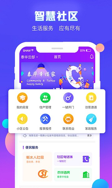邻美社区APP(又叫泰华幸福家)是一个专为小区业主打造的神器,功能超多,简直就是为了方便大家生活而存在的。首页就有邻里圈、办事大厅这些实用板块,感觉像一个专属朋友圈,随时可以看到邻居们的故事,还能参与各种话题讨论,特别有趣。