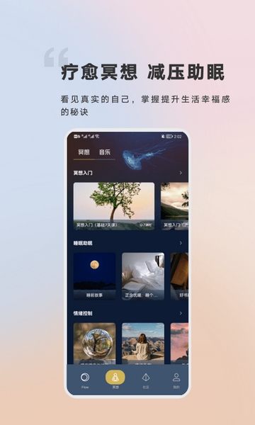 Flow冥想APP的使用场景非常丰富,覆盖了用户日常生活的多个方面。首先,针对不同程度失眠的小伙伴,该应用提供了多种不同方式的助眠方法,旨在让用户轻松入睡。专为睡眠困难用户打造的助眠神器,Flow冥想APP根据不同的失眠症状提供个性化的助眠方法,满足用户多样化的需求。其次,用户可以在应用中聆听各种悦耳的声音,包括大自然的风和水声,这些声音有助于瞬间平复心情,放松身心,帮助用户更容易入睡。不论是在家中、工作中还是在户外,用户都可以随时随地利用Flow冥想APP调整心态,提升生活质量。