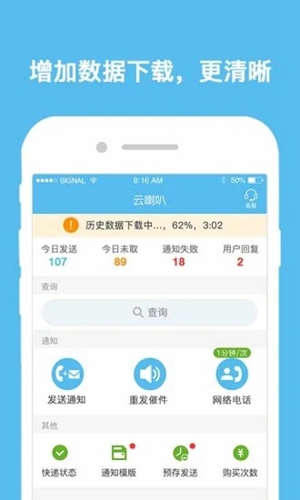 云喇叭APP是一款主打快递信息通知的软件,致力于为快递员提供便捷优质的服务,界面简洁清爽,功能丰富强大,有效提升揽件派件的效率,快递员可以通过这款软件轻松管理订单,并支持一键自动通知客户,网络电话、闪信同时发送!让每一单都能轻松精准送达,大大提升工作效率,同时软件支持对所有历史数据进行云端存储,以便随时下载,避免特殊情况发生,更安心!
