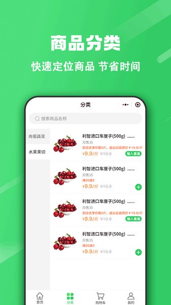 1、下载该软件,在首页有这厨房生鲜,水果,商店超市等商品分类,用户可以根据想要买的商品领取优惠券,下单立即省钱;
