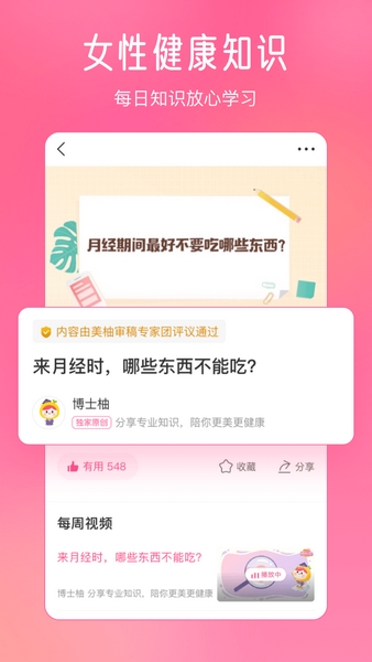 不仅有越用越懂你的经期智能提醒模式,还可根据需要切换为备孕/怀孕/育儿模式,为准妈妈们提供丰富的孕产知识,贴心的孕期提醒。记录宝宝成长瞬间,给妈妈们提供宝宝成长的科学建议。同时还为女生提供了健康、情感、瘦身、美容、购物的知识贴,内置真实的女生交流区,陪伴女性的每一个重要时期!