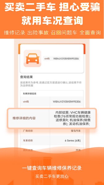 4、查维保,提供车辆历史维修保养记录,历史车况一手掌握。准确地对车辆价值进行评估,减少二手车交易风险。