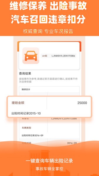 5、查出险,包括事故时间、维修情况,维修金额及理赔信息等。保险理赔记录是确定历史车况的重要依据,从记录中能看出该车辆曾经发生过什么样的事故。比维修保养记录更全面,因为出事故都要报保险,但是维修不一定去4S店。适用于买车前的车况确认、二手车金融检测等需确认车况的场景