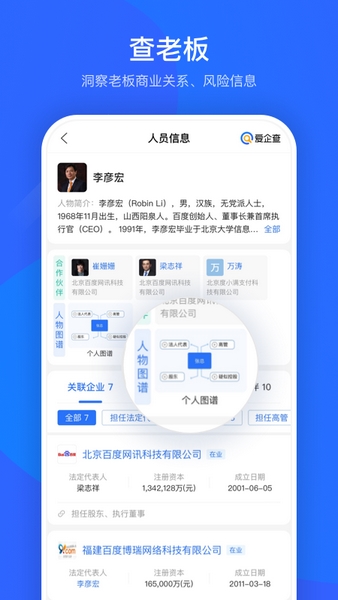 信息全面:和工商局数据对接,查关系,查信用,被执行,专项查询功能即刻找出关联企业或法人股东。