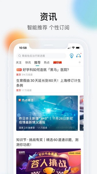 健康界APP是一款主打医学健康知识的软件,用户可以在软件中搜索自己需要的医学知识内容。软件内界面简洁清爽,带来优质浏览体验,各种独家资讯、医健知识每日上新,极简快讯,三言两语就能让你了解最新资讯,搭配专业知识社区,海量大咖云集,在线分享领域知识,更有强大的推荐算法,通过你的浏览喜好,推送你最感兴趣的资讯。