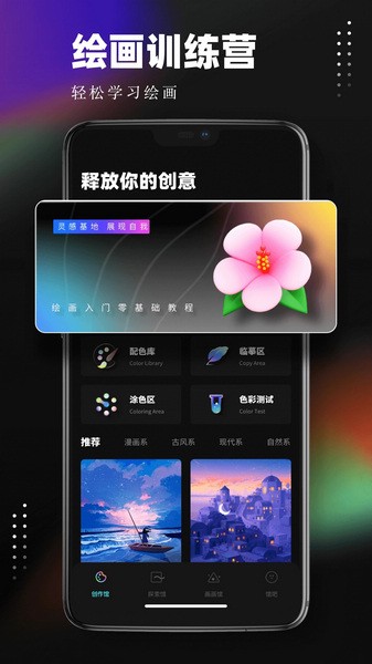 1、通过本站下载软件并安装打开,进入软件后就是【创作馆】页面,我们可以选择配色库、临摹区、涂色区、色彩测试进入;
