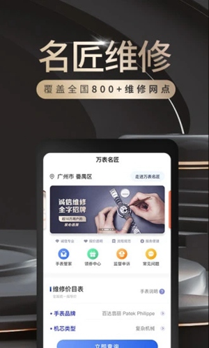 万表平台为客户提供全国钟表售后维修服务,目前全国28省份超过800多家维修店成为万表名匠签约门店,为消费者提供专业可靠的手表检测、保养、维修等售后服务。