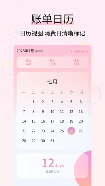 在账单日历中用户能够清晰查看自己的记账情况,以便查看记账时间等;