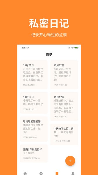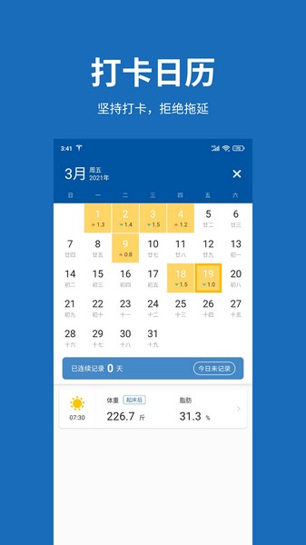 体重日记是一款简单好用的手机减肥体重记录软件。这款软件可以创建并记录用户每天体重的变化,并根据这些数据来生成一个趋势图,以此来直观地展现用户的体重变化趋势。除了体重之外,三围、体脂率等都可以记录,每天都可以打卡记录,且可以对创建的日记内容进行加密保护,保护好自己的隐私。此外,用户还可以更换界面的外观颜色。