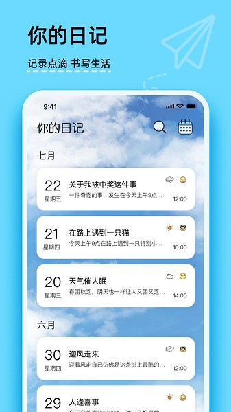我最喜欢它的功能是时间轴展示,像看时光机一样回顾过去的日子,特别温馨。而且可以记录地点、天气,还能加照片,让每一篇日记都变得生动起来。最贴心的是云端保存,再也不用担心日记会丢。