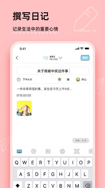 2、多元记录: 日记不再单调,记录地点、天气、添加照片,让每一篇都是独特的记忆。