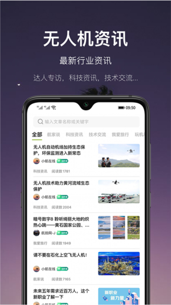 2、资讯,这里有各种关于航拍的新闻资讯,有科技资讯,也有旅游攻略,你可以选择感兴趣的进行查看;