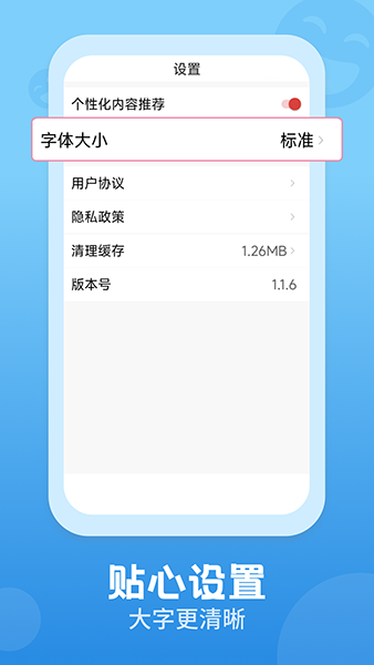 为用户提供大号字体贴心设置,通过大号字体的显示来让用户查看文字更清晰。
