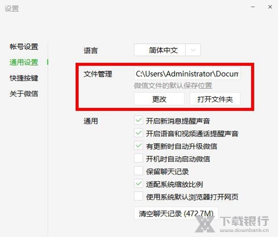 4.在通用设置下面,有一个文件管理,就是微信电脑版文件保存的位置了,用户可以选择更改,或者是直接打开文件夹。