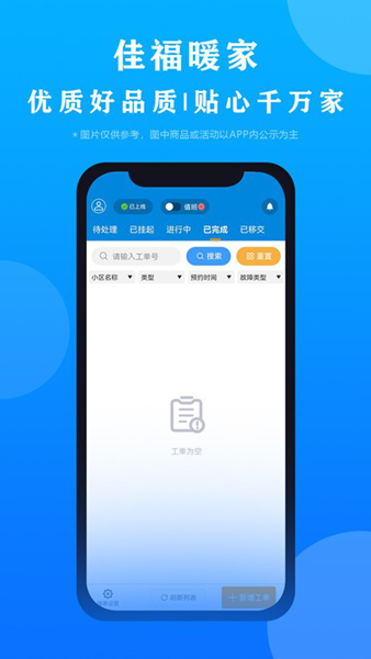 佳福暖家是一款提供各种维修服务的综合性上门服务平台。软件内拥有高效的办公服务系统,维修人员将在这里获得专业的业务培训和技能培训,覆盖生活中常见的各种水电维修问题。当您有序下单后,软件内的客服人员会通过电话或者线上接听用户的为序诉求,确定后将会编辑维修订单进行派单操作,维修人员则会查看维修订单,并根据实际情况进行对维修订单的处理,十分便捷!