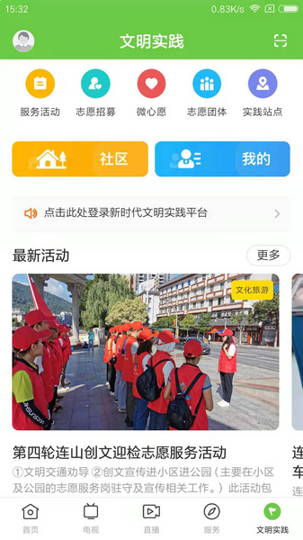 6、进入文明实践页面,查看推荐的实践活动、志愿团体、实践站点等