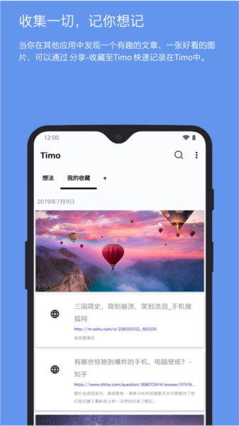 当你在其他应用中看到想收藏的内容,可以通过\"\"分享-收藏到Timo\"\",轻松快速保存在Timo中,想保存的东西一样不落。