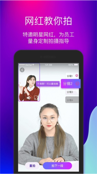 选择任务,参与DIY拍摄,在每一个分镜中学习如何摆POSE,做表情,情绪表现等短视频拍摄技巧!特邀明星网红,为员工量身定制拍摄指导!