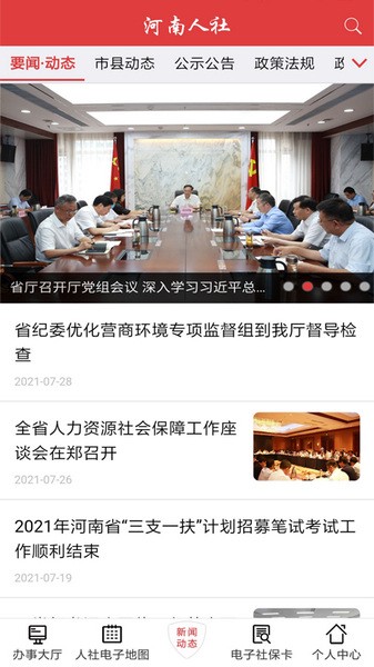 1、在本站下载并安装河南人社,进入软件可以查看首页各种资讯