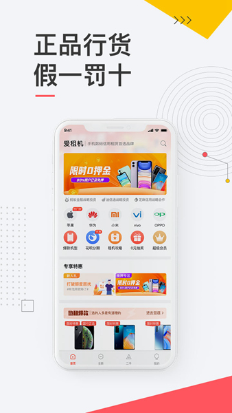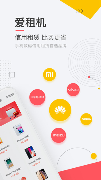 爱租机是一款主打智能手机租借的软件,界面简洁清爽,产品丰富齐全,种类繁多,汇集海量知名品牌机型,囊括华为、魅族、Vivo、OPPO等应有尽有,满足不同偏好的用户进行租借!除手机外,更有家居家电、电脑平板等栏目等你来发现!同时平台还结合了芝麻信用,如果分值大于600达到标准,还能0押金快速租机,使用更便捷!此外更有不定期推出的优惠劵,让你租机、购机更省钱!