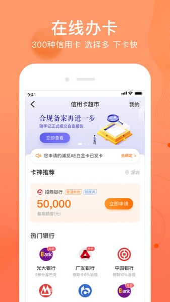 1.支持广发、平安、招行等数十家主流银行免费办卡服务,放心;